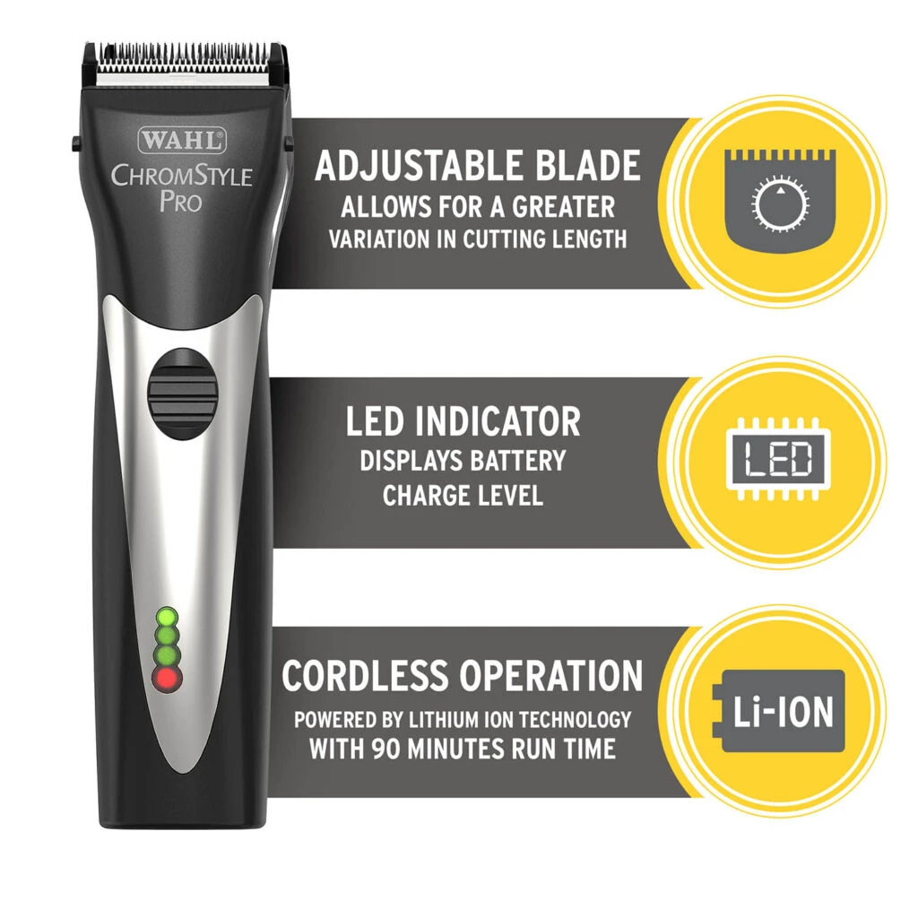 The Wahl Chromstyle offers cordless bulk removal and tapering. Lithium Ion technology provides 90 minutes run time with adjustable blade for wide variety of cutting lengths.