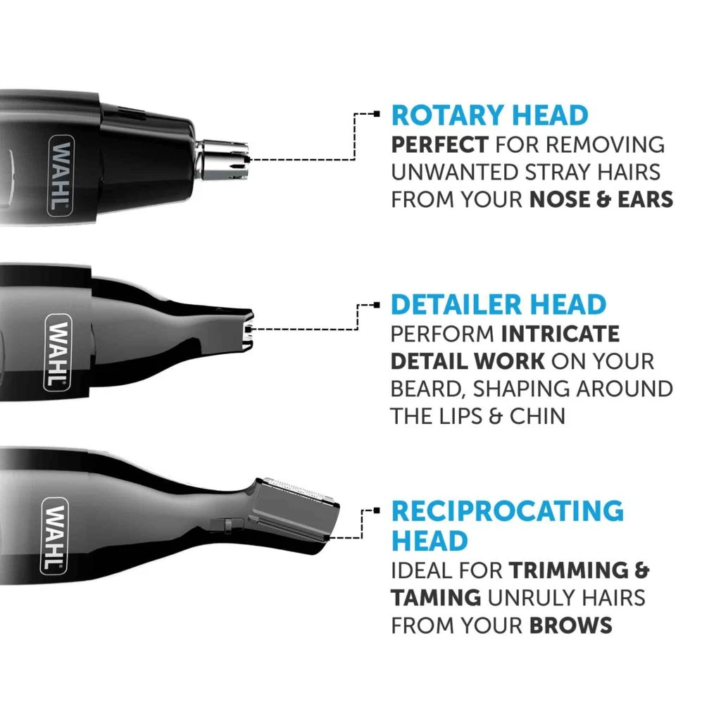 The Wahl Ear / Nose / Brow Trimmer is a rechargeable personal trimmer that is the ideal grooming accessory featuring three cutting heads.