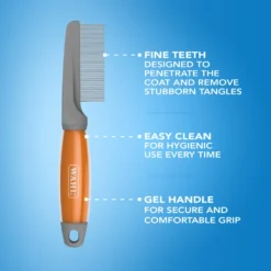 The Wahl Grooming Comb is a fine comb with long, durable stainless steel teeth designed to penetrate the coat for better coverage.