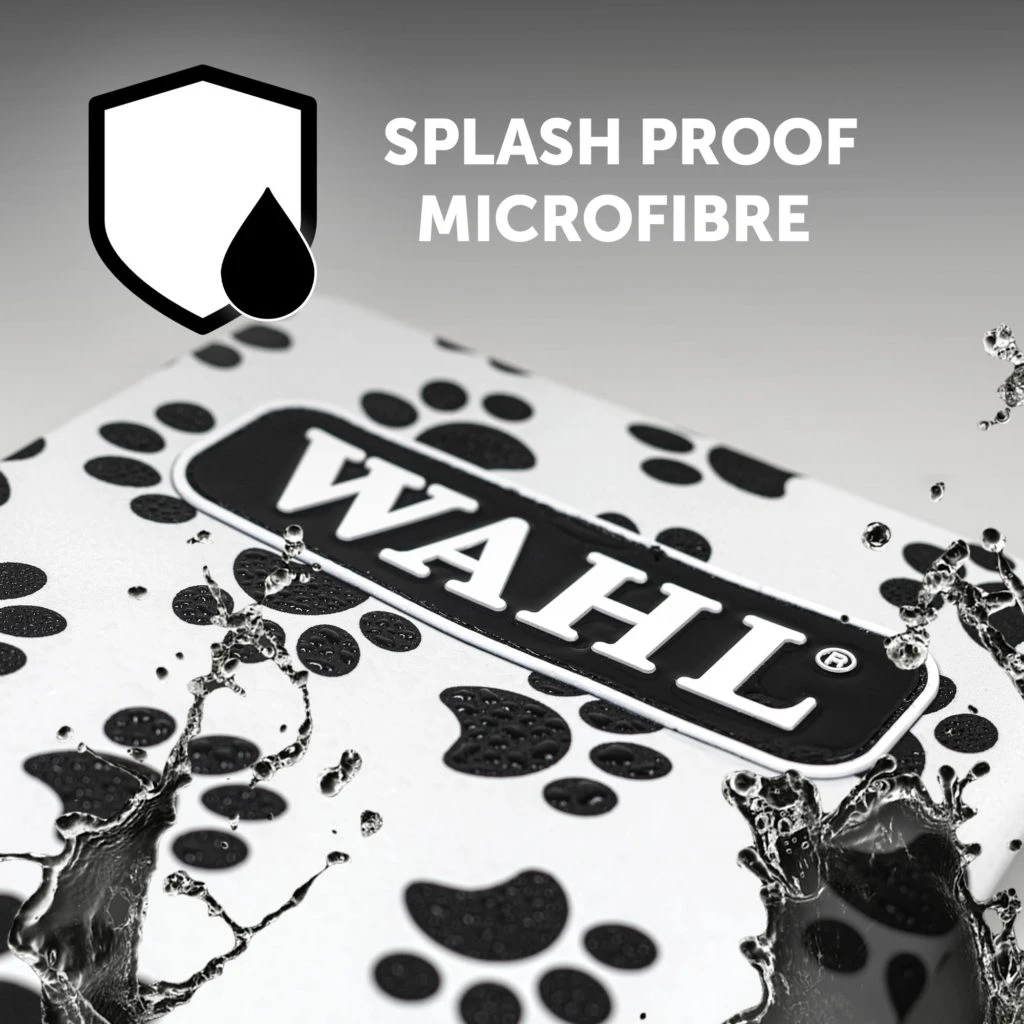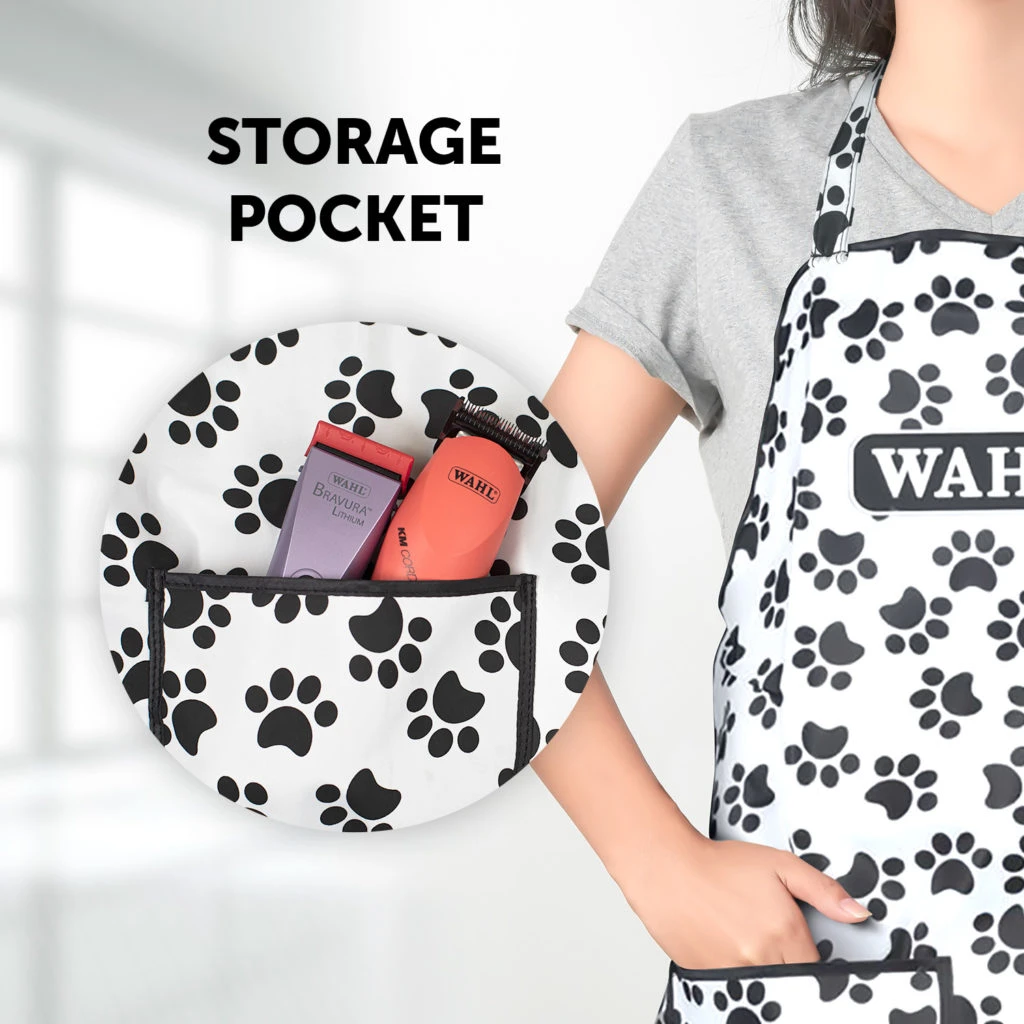 Paw Print Apron is made from durable, splash proof micro fibre that protects from natural hazards of bathing and grooming. Designed with storage pocket, adjustable neck and waist straps.